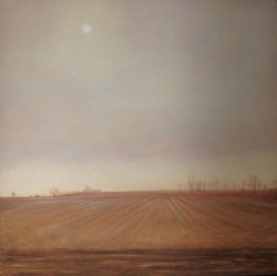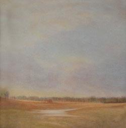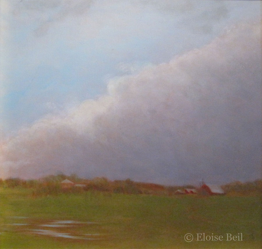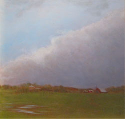 Over the years I have painted many views from a landscape that I savor on a daily basis – along the road between my home in Vergennes and my work at Lake Champlain Maritime Museum. “Big sky country,” Vermont style, observed at all times of day and in all seasons, has inspired a series of paintings that capture ephemeral moments: a changing weather front, a glimpse of the sky reflected in a vernal pond. The series name, Vanishing Points, is taken from the painting of a snow squall that threw into high relief the graphic lines of plowed fields converging on a distant farm: within minutes, the sun will vanish behind the clouds; the snow will melt in a day or a season; and every year more of the old barns and open fields vanish from the landscape.